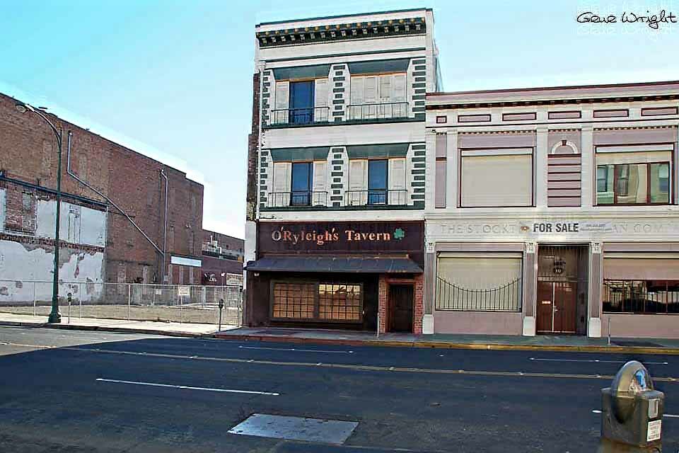 20 N. California - 'Ryleigh's Tavern / Delmonico's, Sterling Hotel, New California Hotel - The building was constructed in 1906 and housed a small hotel on the second and third floor. ·The ·first floor was one of Stockton's most popular eating places. The restaurant was known as Delmonico's, and specialized in Italian-American food. By 1929 and through 1950, Danner "The Paint Man" Paints was located here. By 1955, Dane's Health Foods had taken over the space. By 1960, Gall's Men's Shop was located here.