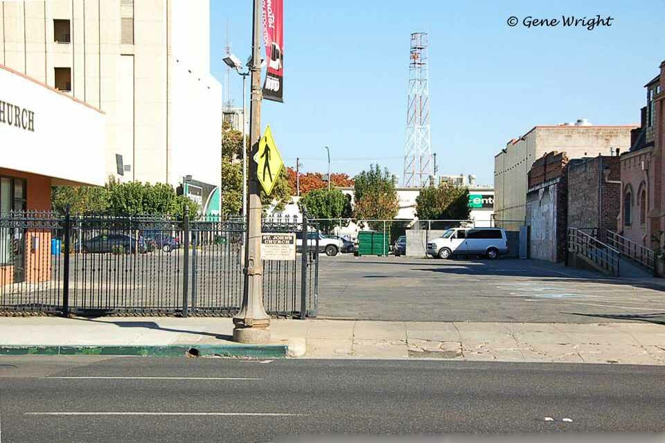 Right photo, The street in the foreground, where the Stockton Archive lettering is, is Tuleberg Levee. Now gone and covered by MLK Plaza, it ran diagonally from Fremont and Center to Eldorado and Oak. The photographer would have been standing on Tuleberg Levee and El Dorado, pointing the camera NW across the gas station property towards Oak. The house in the background is the Hewlett house which was demolished to make way for the Chavez library.