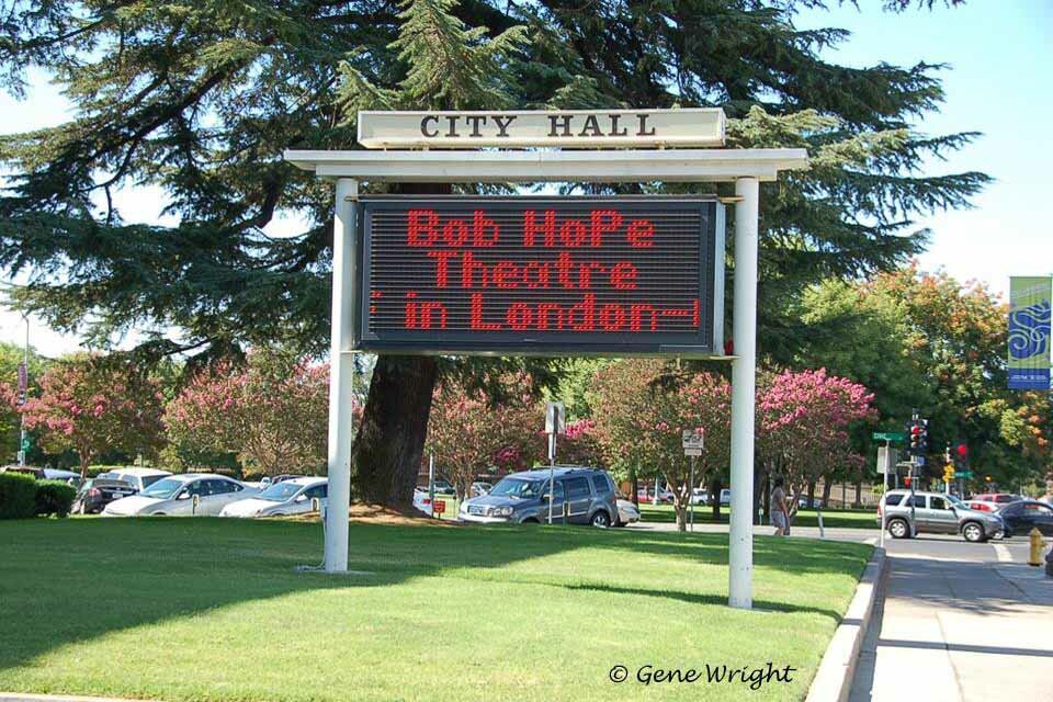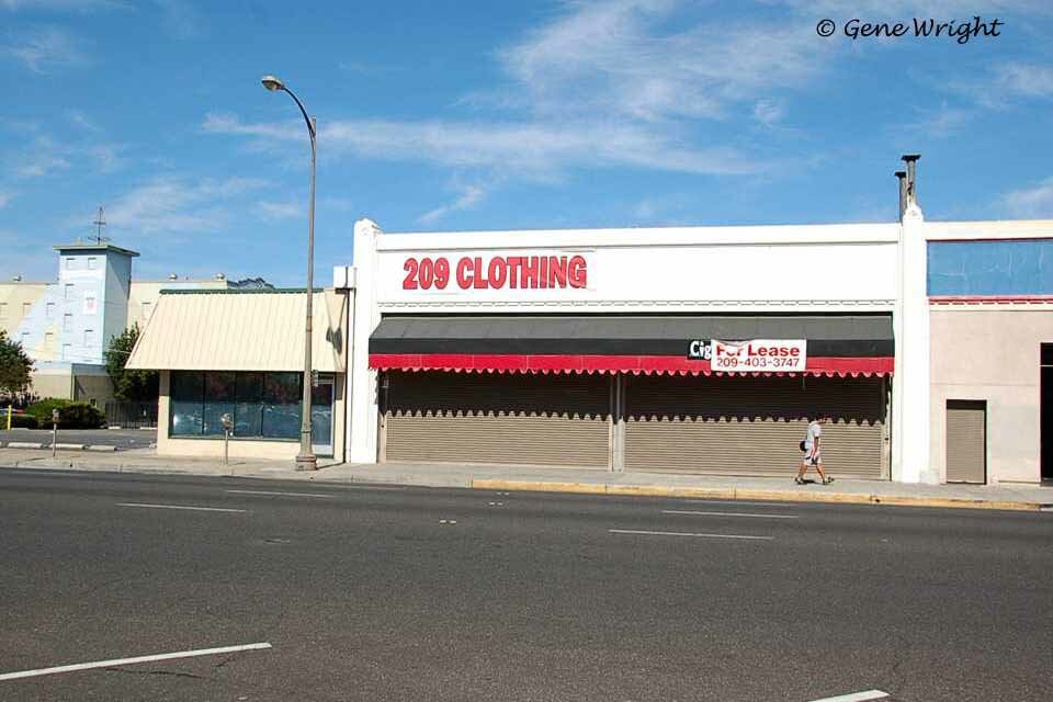 200 Block of North El Dorado Street showing part of City Centre Cinemas at the left, the side of the B&M Building at 25 Bridge Place in the center and part of the Hotel Stockton ar the right