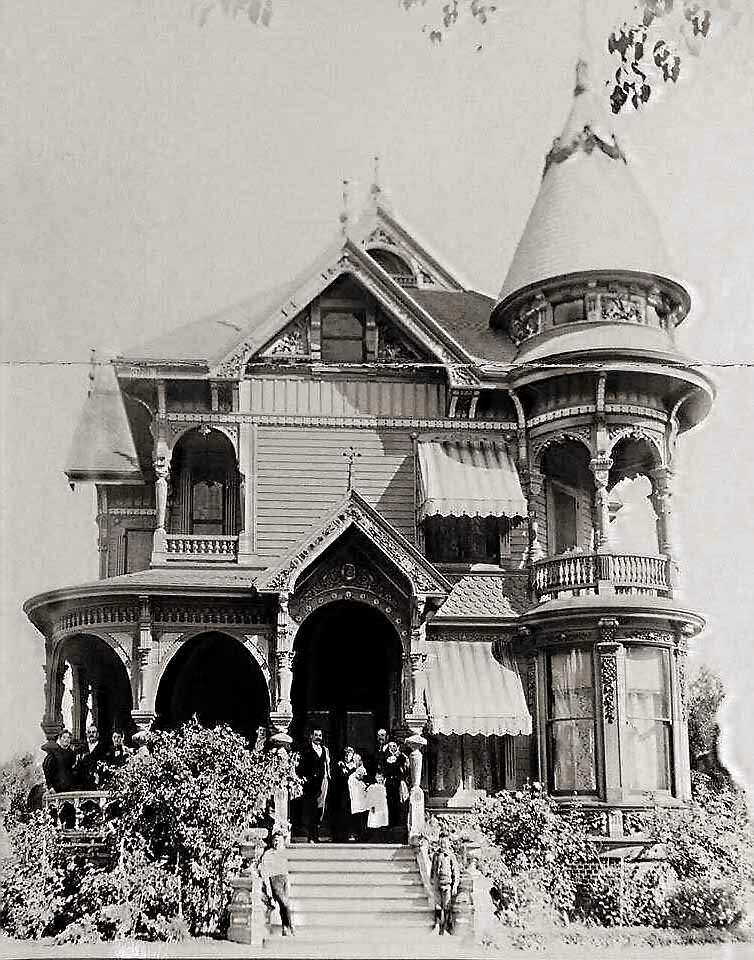 Home of J.D. Peters, 1043 N. El Dorado Street, 1902. Covert V. Martin photo. J. D. PETERS, of Stockton, was in his early days a sailor, and was, at the breaking out of the gold excitement, in the city of New Orleans. He started from that place with fourteen other young men across the plains. He spent several years among the miners, working and driving teams. In 1837 he embarked in the grain business, and was from 1869to 1868 the confidential agent of Isaac Friedlander, purchasing on his account immense quantities of grain. Since that time he has conducted his grain business in his own interest. He inaugurated the popular system of storage, which now obtains in this valley, and built the first warehouse erected in Stockton. He had been largely interested in banks, railroads, shipping, and many enterprises that have redounded to the benefit and profit of the valley and the city of Stockton. He owned in interest in the barque J.D. Peters, the steamer Herald, the barges Excelsior and Commerce, and the tug Frolic, all of which are engaged in river transportation, between Stockton and San Francisco. At the time of the suspension on the Bank of California, Mr. Peters alone, of all the grain dealers of the San Joaquin valley, continued to purchase and pay cash for grain. Mr. Peters, although still a young man, had by his energy and business enterprise, amassed a fortune, and was the central and moving figure of the Stockton levee