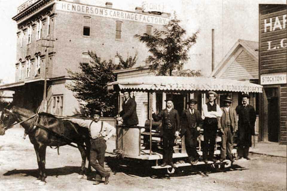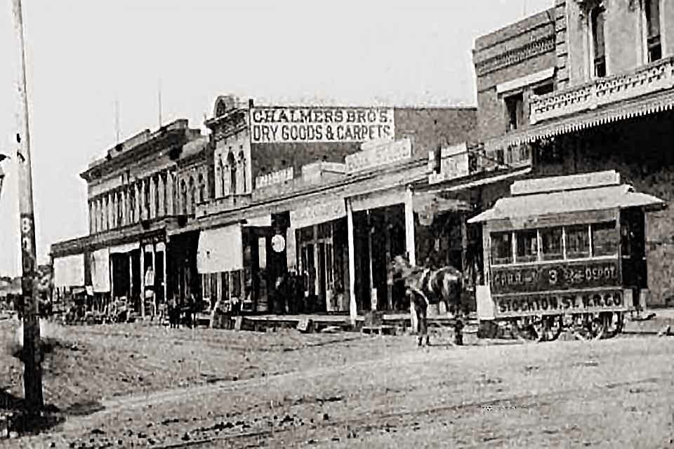 192 East Main Street - 1889 Horse drawn Stockton Street Car heading north on El Dorado from Main Street. Part of the Holden Drug store is on the right. Demolished