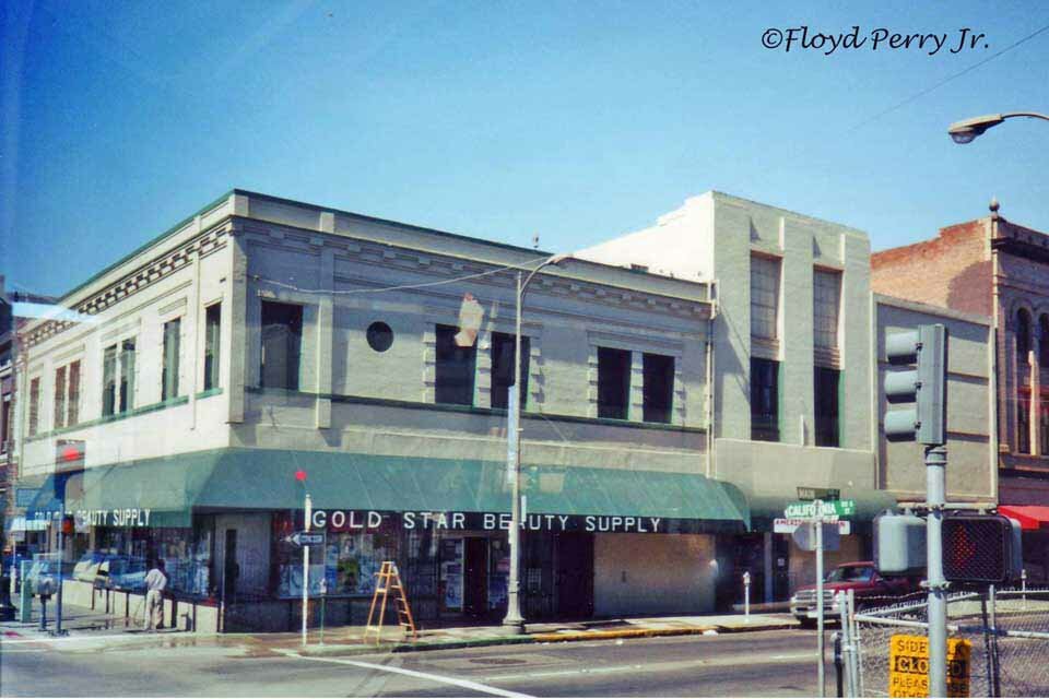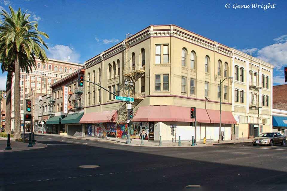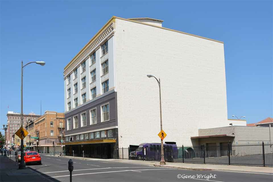 439-447 E. Main St. at California - Built in 1895 - The Hotel Main building has addresses at 447 E. Main and on N. California. Listed as the Hotel MacAllister in Stockton City Directories as early as 1912, the name changed to the Hotel Main by 1925. By 1930, Kuechler & Sons Jewelers opened a shop on the Main Street side of the building, and Wilson's News Stand and California Floral Company were on N. California. All three businesses remained in the building through 1950. The ground floor was last consumed by K. V. Furniture. This may have once been part of the Commercial Hotel, next door at 425-29 East Main, starting in the 1880s. A sign on the roof of 439-447 East Main, installed in the 1880s and since removed, once announced the building as the Commercial Hotel. The storefronts of this building have been remodeled, and a large bay window on the second and third floor corner has been removed, but the upper floors are otherwise relatively intact. Bottom left photo by Floyd Perry Jr.