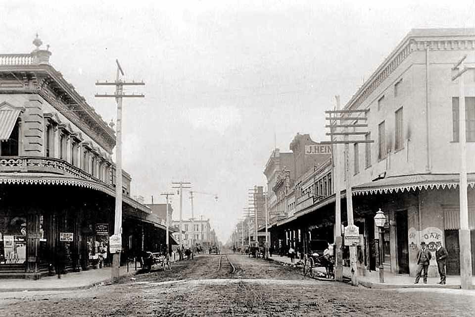Main Street looking East from El Dorado - Posted by Kevin Shawver 106 East Main - Hollywood Hotel (50) / Eagle Hotel - Demolished Main and El Dorado Streets. Main and El Dorado Streets. Holden Drug Store at - 1886 - Main & El Dorado Freight wagon and trailer headed to the waterfront for supplies - 1860's 101 E. Main - State Loan & Jewelry / 1928 - Forty Nine Drug Company - Demolished
