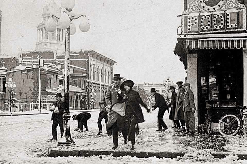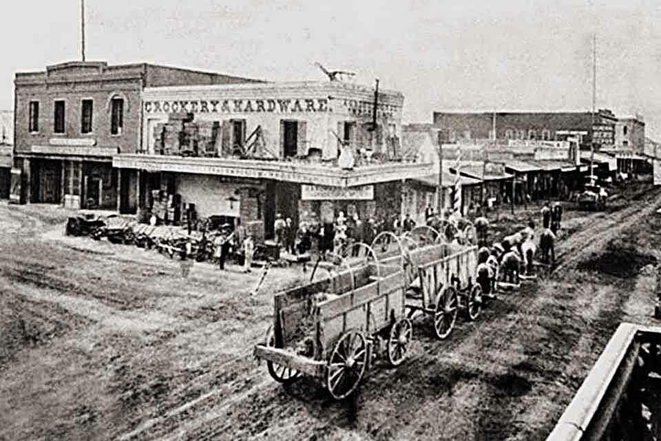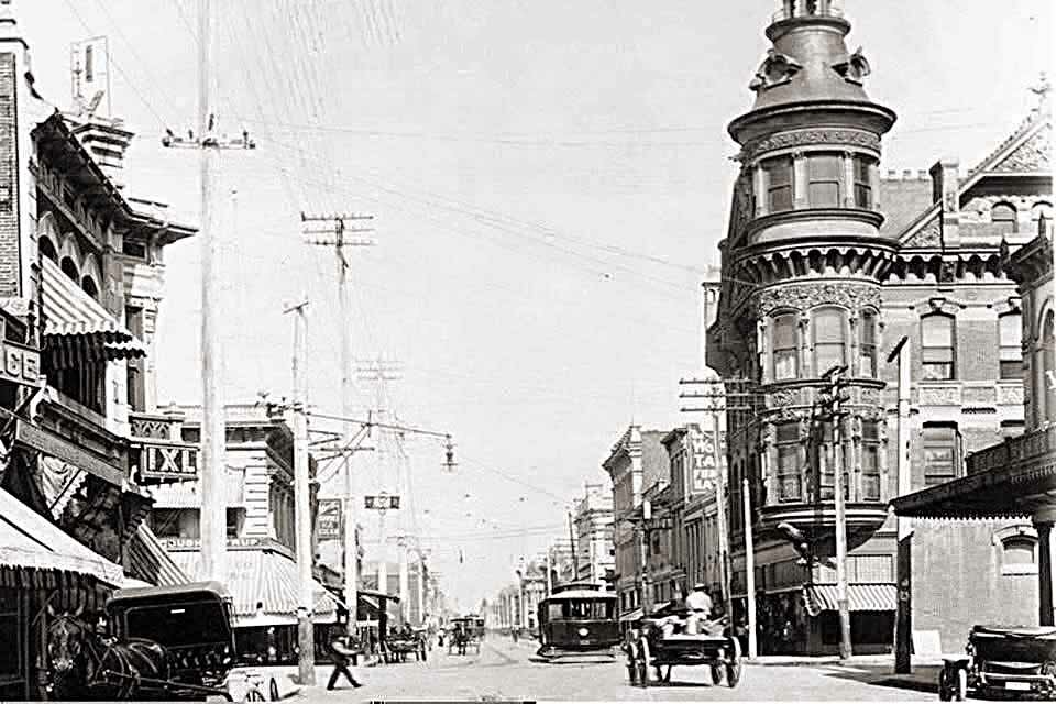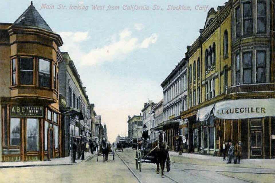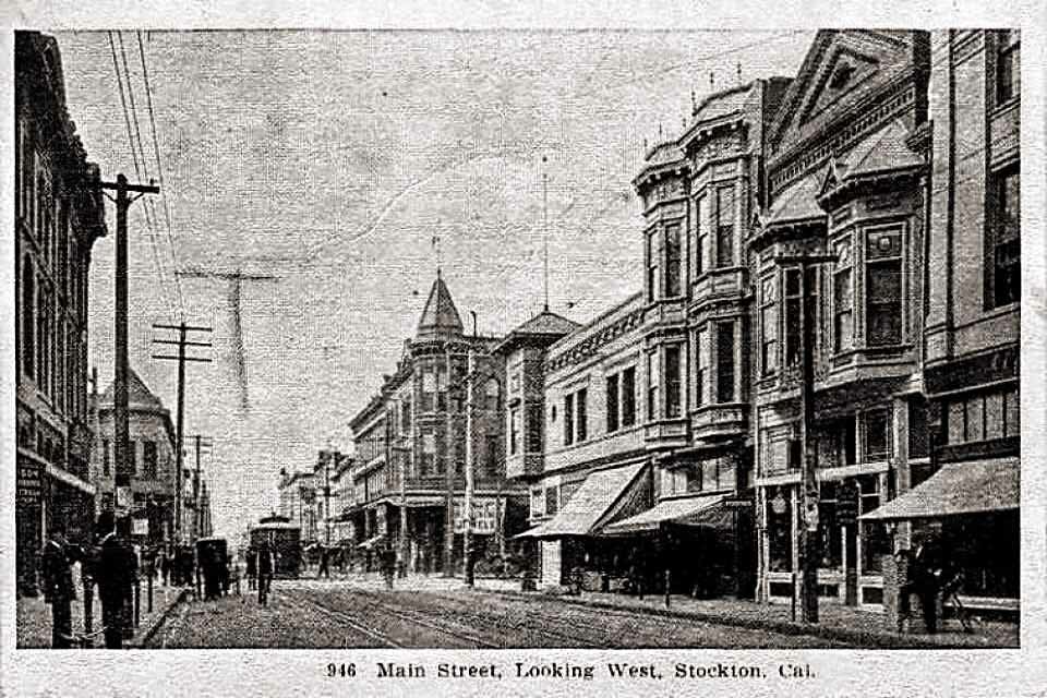 Main & American looking west. Second photo; Main Street and American Street in Stockton, looking west on Main Street, ca.1900. The intersection is in the foreground at right and is paved with cobblestones. Two sets of streetcar tracks run down the middle of Main Street, and a streetcar is visible in the distance. A large horse-drawn wagon is in the middle of Main at center. The streets are lined with sidewalks, two- and three-story buildings, and lines of utility poles. In the distance at right, a cylindrical tower with a pointed roof is visible