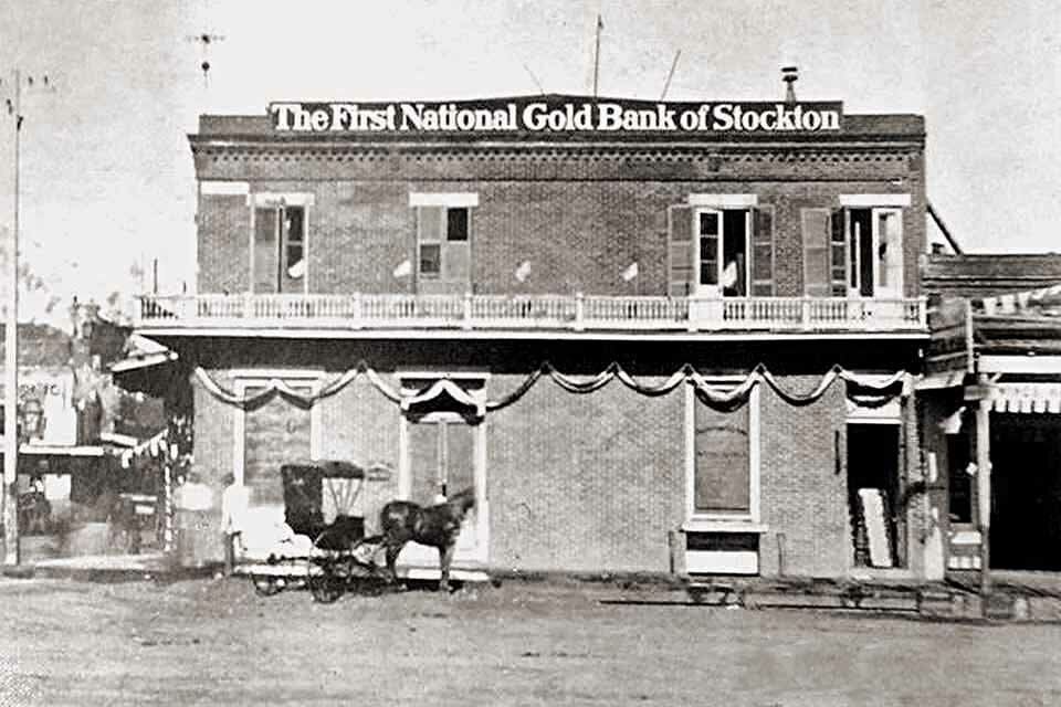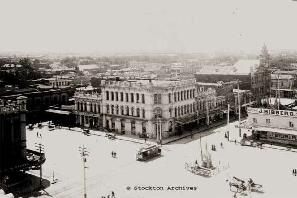 The 1891 City Directory lists the San Joaquin Valley Bank at 210 E. Main St. - G.B. Clairborne, President and Charles E. Perkins, Cashier - Demolished. Later moved to 11 N. Hunter St. and became The Bank of Italy (1917). Renamed Bank of America in 1930. The upper floors were removed in the 1940's and a modern facade covered the front