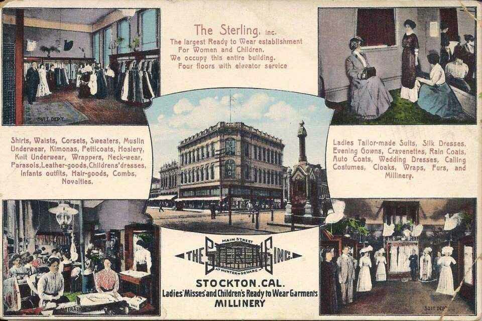 111 E. Main - City Grill (1935) - Demolished 112 E. Main - Karl's Shoe Store (50) - Demolished 113 E. Main Broadway Hotel (50) / Broadway Rooms (1928) - Demolished 114 E. Main - Orpheum Theatre - Demolished 118 E. Main - Aaron's Mens Clothes - Demolished 119 E. Main - 1928 - Jeffrey Brothers Shoes - Bank of America Main St. Entrance - Demolished 120 E. Main - Quinns Stationary (1928-1950) - Demolished 122 E. Main - Hotel Oakland (50) - Demolished 124 E. Main - Moler Barber College / The original location of Smith & Lang - Demolished 126 E. Main - Empire Loan & Jewelery - Demolished 129 E. Main - Hunter Square Loan & Jewelry - Demolished 132 E. Main - The Sterling Women and Children's Clothes The Sterling was a popular clothing store SW corner of Hunter and Main St. from1908-1960's. The store was four stories and included an elevator. Stockton Savings & Loan Society (Bank of Stockton) occupied this building from 1875 until they built their "skyscraper" on Main & San Joaquin in 1908. Jones & Hewlett 1860s. Main & Hunter - Importers and dealers of farm implements. They sold the celebrated chisel cultivators, hand and horsepower seed sowers, fanning mills, hay and straw cutters, corn shellers and road scrapers.