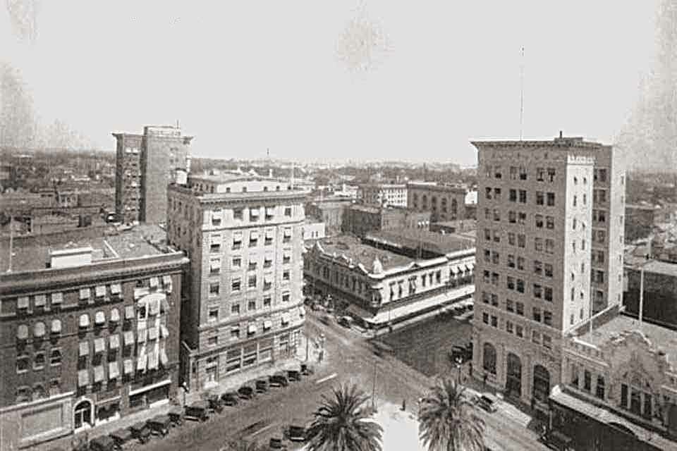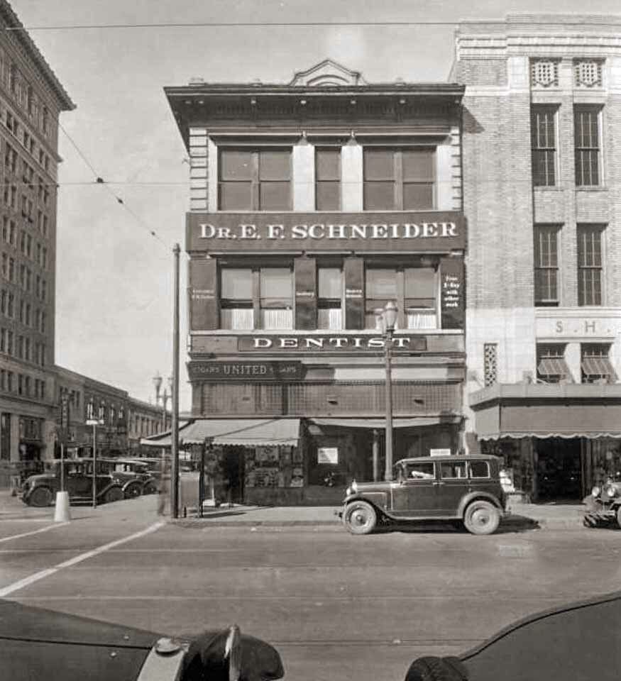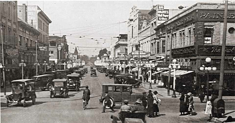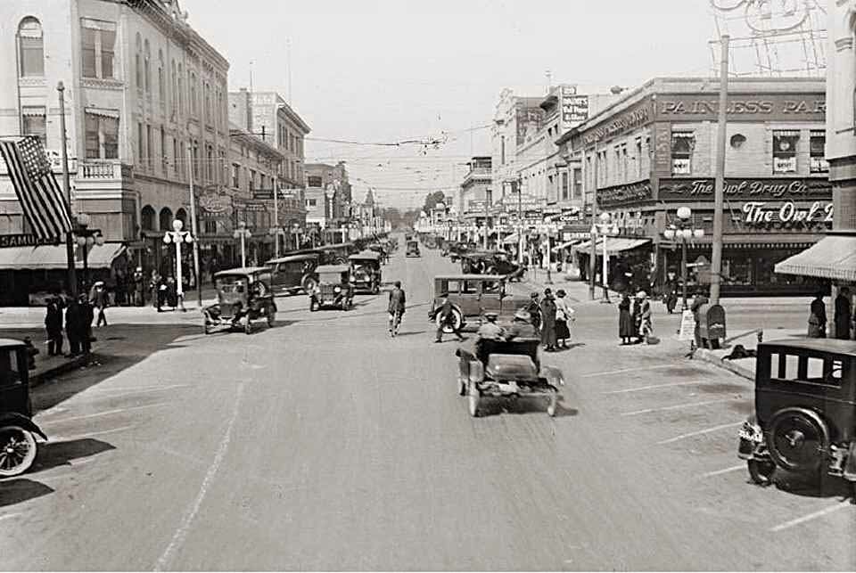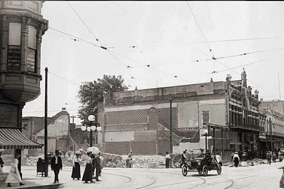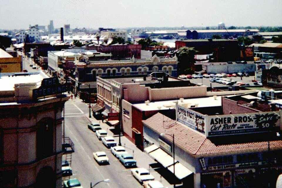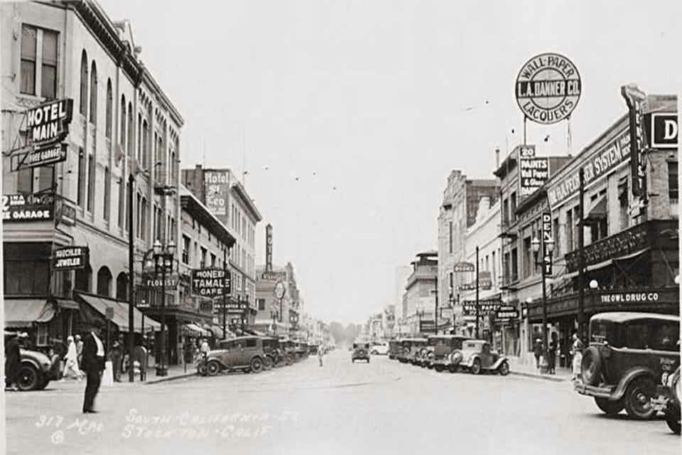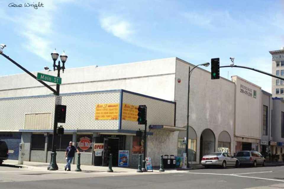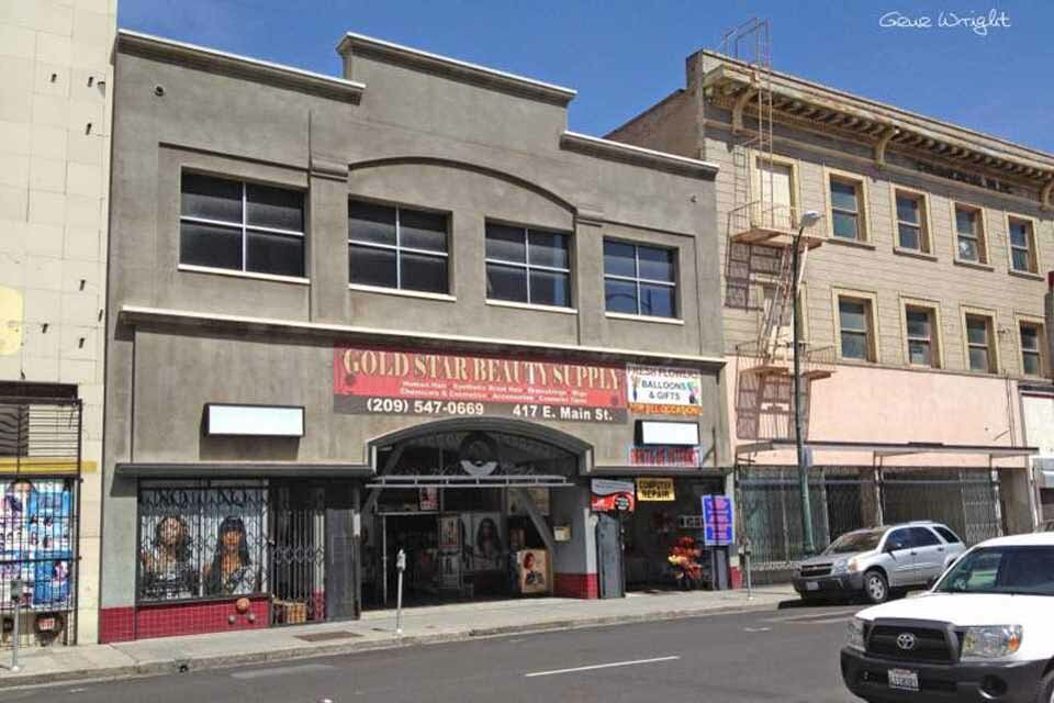 323 E. Main - Former Second Esquire Theatre / Former State Theatre (1943) - Demolished for a parking garage. In the lower left is 313-321 E. Main St - Bravo & McKeegan (1937-1955) before they moved to San Joaquin & Weber Overman's Malted Milk Shop was at 325 E. Main in 1931.