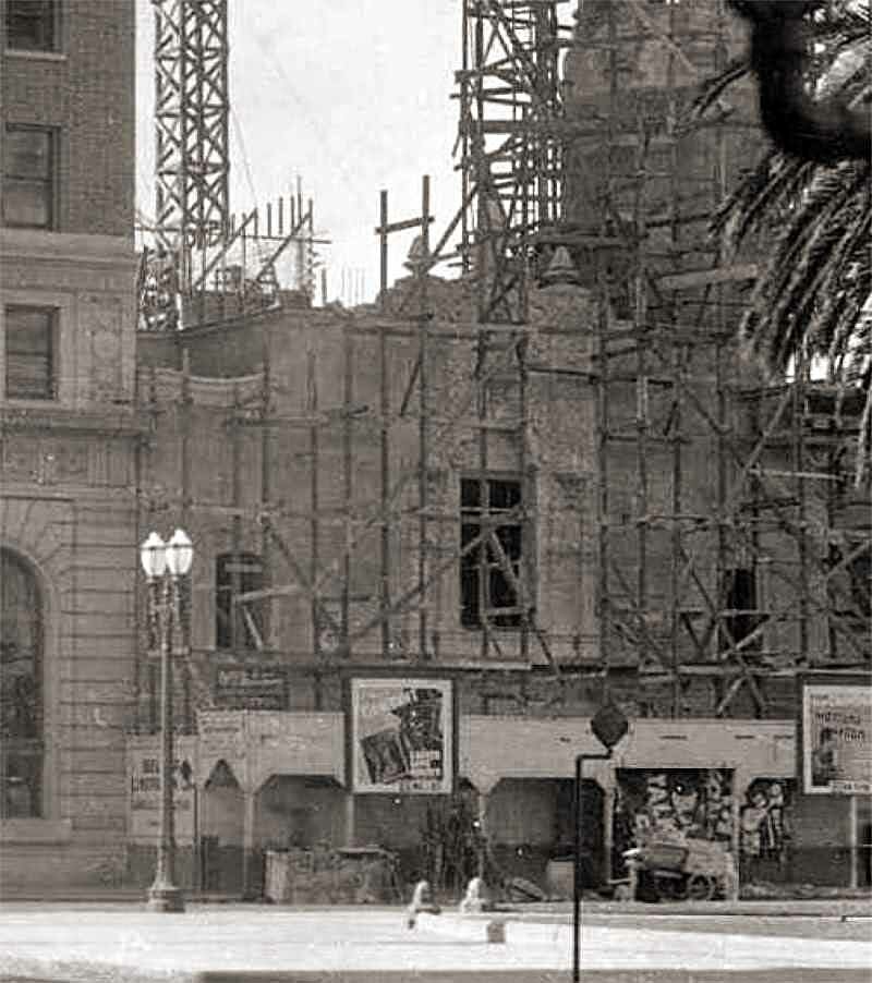 200 Block of E. Main Street at Hunter looking East - Left photos, 2013, right photo,1950s - The building on the right at 214 East Main was the Rialto Theatre in 1928 - Through the palm trees you can see part of the American Trust Sign - The second courthouse is on the left - The Rialto Theatre dates back to at least 1922 when a Robert-Morton organ was installed. It was renovated in 1949, to the plans of architect William Glenn Balch. The Rialto Theatre is still listed in the 1952 Film Daily Yearbook but not in the 1955 edition. - Demolished for a court house annex