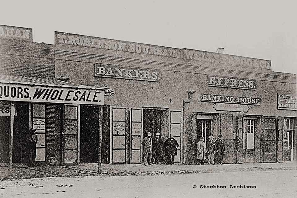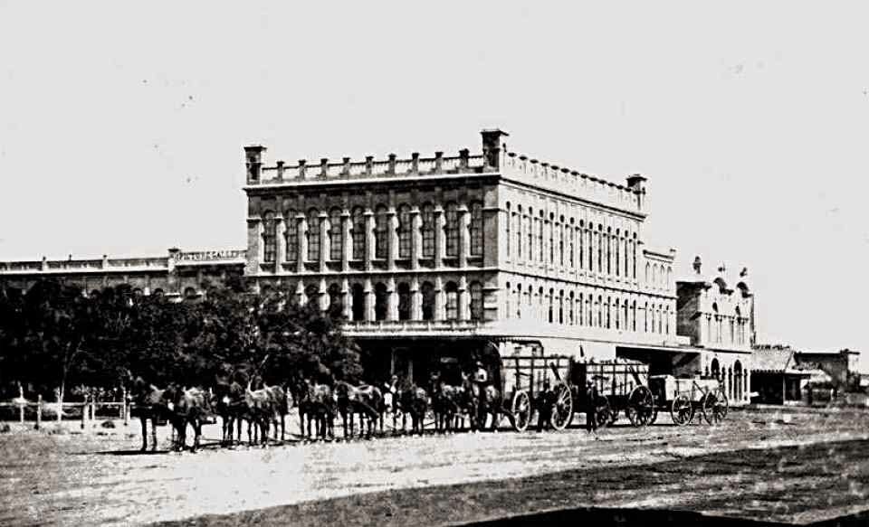 Main & Sutter - Wells Fargo and Co. Express Banking House and T. Robinson Bours and Co., built 1853. Taken 1860