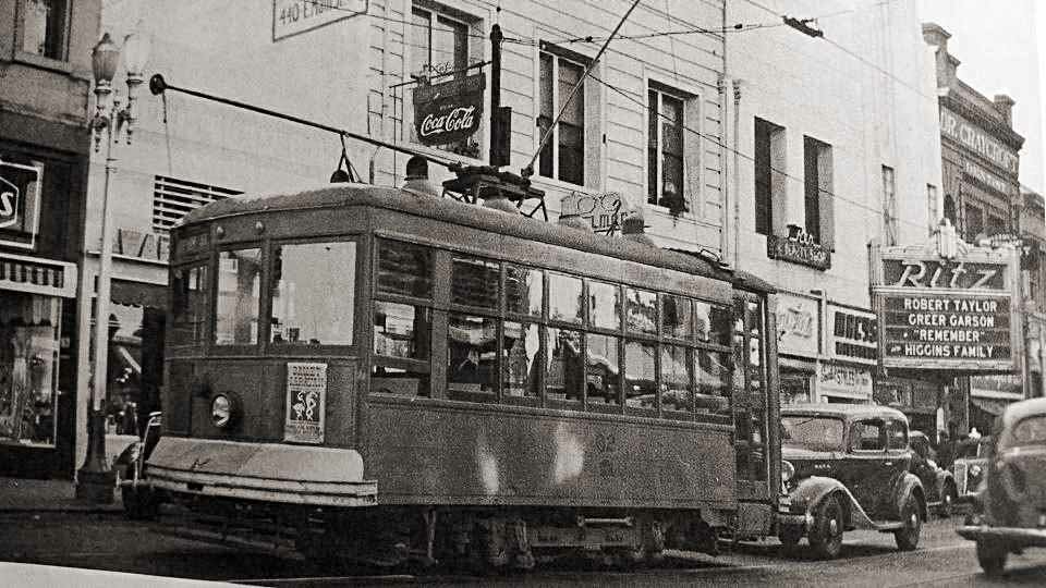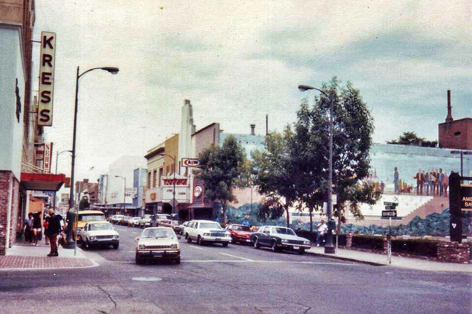 In the center photo: from 1961, this time looking westerly along Main toward El Dorado. The Sterling is on the left edge. On the north side of Main are Asher Bros. Shoe store at the corner of Main and Hunter and at the other corner at El Dorado the former Holden Drug Store. The building with the windows that look like lower case "m's" is the Penial Chapel. posted