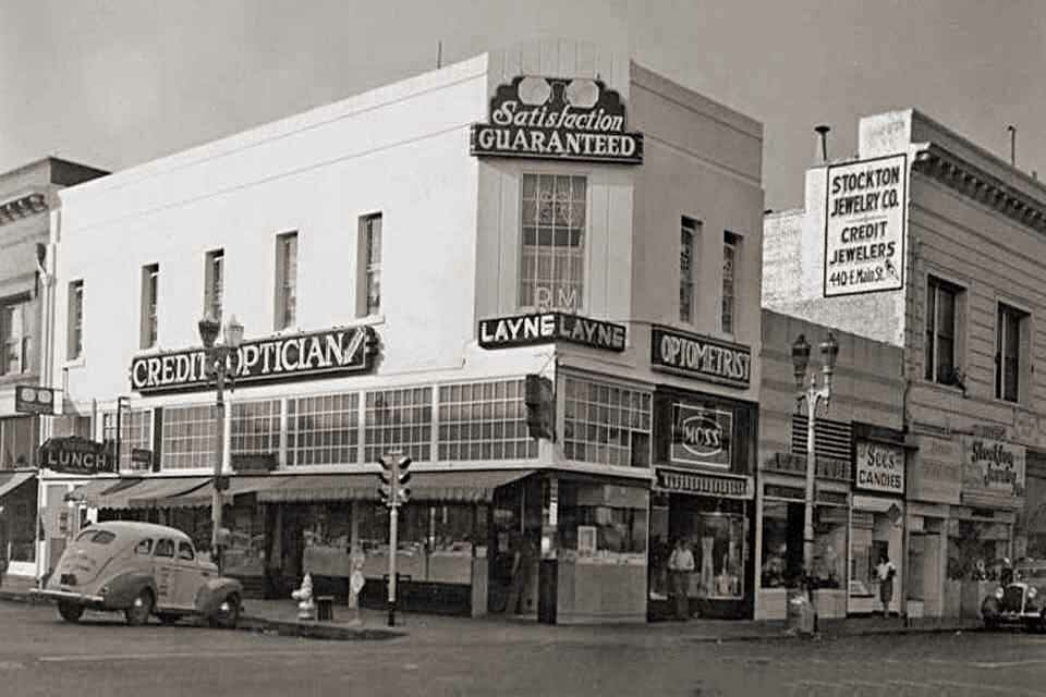 425-431 E. Main St. Commercial Hotel Built in 1874 by George F. Smith at a cost between $25,000 to $30,000. It was two stories high, and 90 by 75 feet in dimensions. In 1878, a third story was added at a cost of $5,000, improving the appearance of the building. The hotel was leased and managed by F.C. Hahn in 1875. The hotel contained sixty-one rooms and was entirely refurnished and re carpeted in 1878.Early photographs indicate the building has been remodeled. This is one of the older buildings in downtown Stockton . The 1912 Stockton City Directory listed this building as the Commercial Hotel, a title it retains still. By 1930, Millers Bootery occupied a store on the ground floor. Charles Haas and Sons, Jewelers, had a store here by 1930 and through 1950. Suntag Drug Stores took over the Bootery by 1940, and occupied the space until at least 1950. Once Called McAlister Hotel - 425 E. Main St. - Charles Haas & Son Jewelers