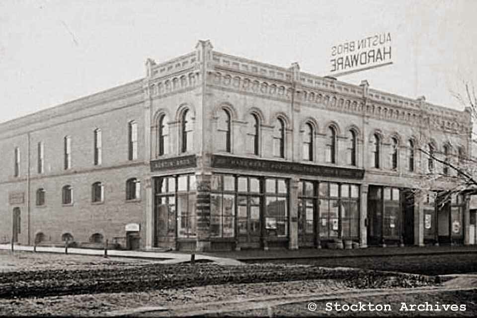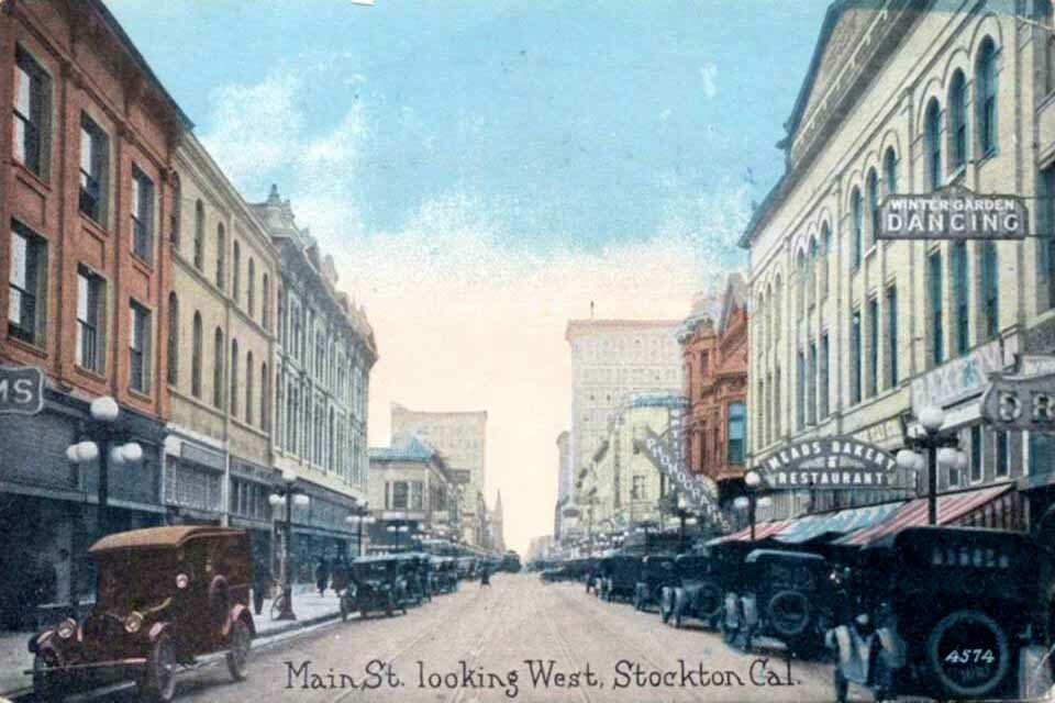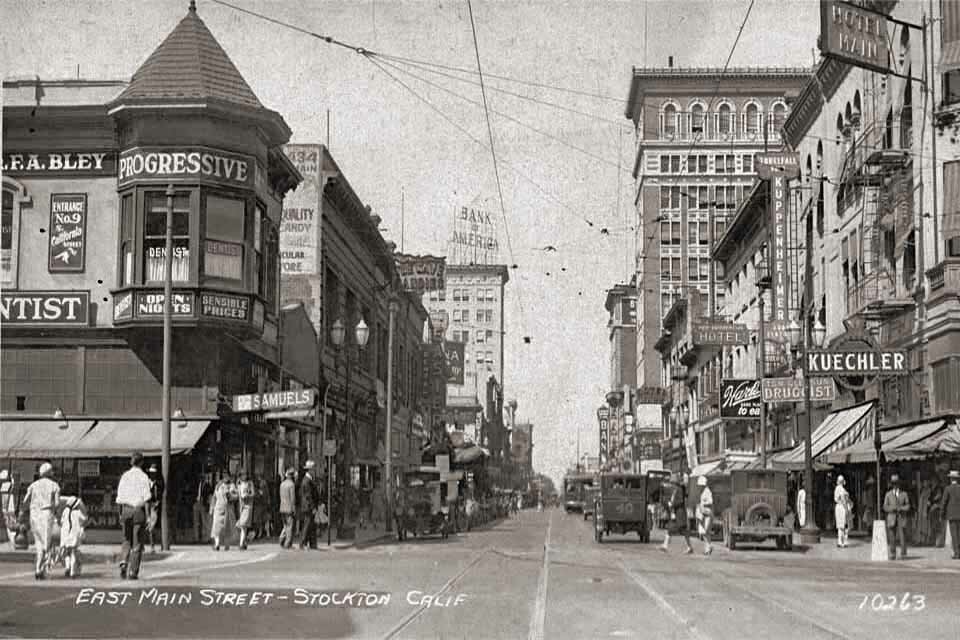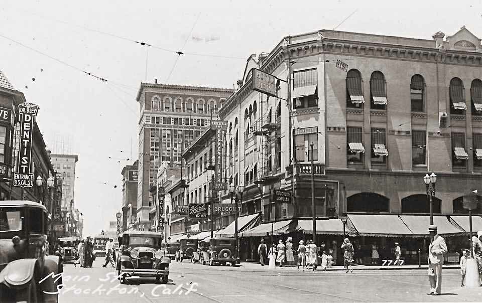 533-545 E. Main St. - Now known as the Brown-Mahin and Hotel Terry Building. Built in 1912, the building was originally called the Hotel Rex. The hotel housed permanent and transient guests. It acquired its current name, Hate/Terry, between 1920 and 1925. The ground floor was originally used by the Katten Brothers Dry Goods. Other ground floor businesses over the years have included Goccino's Grocery, Katten Marengo Inc. Department Store, Hansen & Zinck Drugs, Kasper & Wilson Co., Jewelers, and Fashion Plate Shoes 531 - Druids Hall / Eagles Club 536 E. Main St. - San Francisco Floral 547 E. Main St. - 1928 - Stockton Paint Company 540 -546 E. Main at American - Constructed in 1890, this historic building jointly functioned as two hardware stores, Austin Brothers and Hickenbotham Brothers Hardware & Steel. In the 20s it was Stockton Dry Goods. In the early 50's the building became the first Esquire Theatre. In the later 1950's after renovation, it became J.C. Penney's Department Store. Later in the 1980's, American Savings Bank purchased the building and completely renovated it for office and bank use. Currently fully occupied as the new Family Law Courthouse for the Superior Courts of California