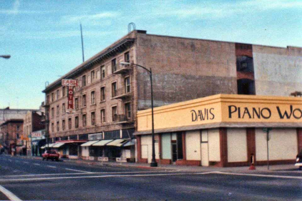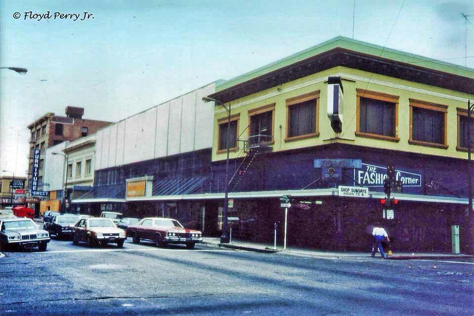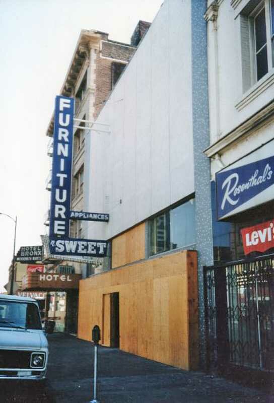 601 E. Main Street - Breuners Building 634 E. Main St. - 1987 N. SWEET & SONS FURNITURE store between Rosenthal's Clothing (now San Joaquin EnvironmentalHealth Dept.) and the Hotel Bronx (now Main Street Manor). - Photo Courtesy of Floyd Perry Jr.
