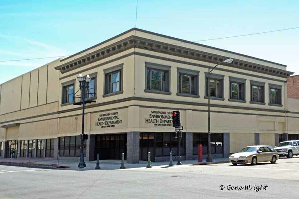 600-608 East Main Street - Southeast Corner Of Main & American Streets today. Former ROSENTHALS (SF Floral before that) - Hard to believe it's the same building. Awnings removed, colors toned down from previous photo - Now San Joaquin County Environmental Health Center - By 1912, H. L Laska, a tailor, had a shop here. By 1935, H. U. Okamoto had an art goods shop in this building. By 1945, R. L DuBois, women's clothier, was at this address. The large retail space is currently used by the St. Vincent de Paul Thrift Store. The building appears to have been constructed c. 1912. This building has been heavily altered, impairing its individual integrity, - 1928 Stockton Hardware
