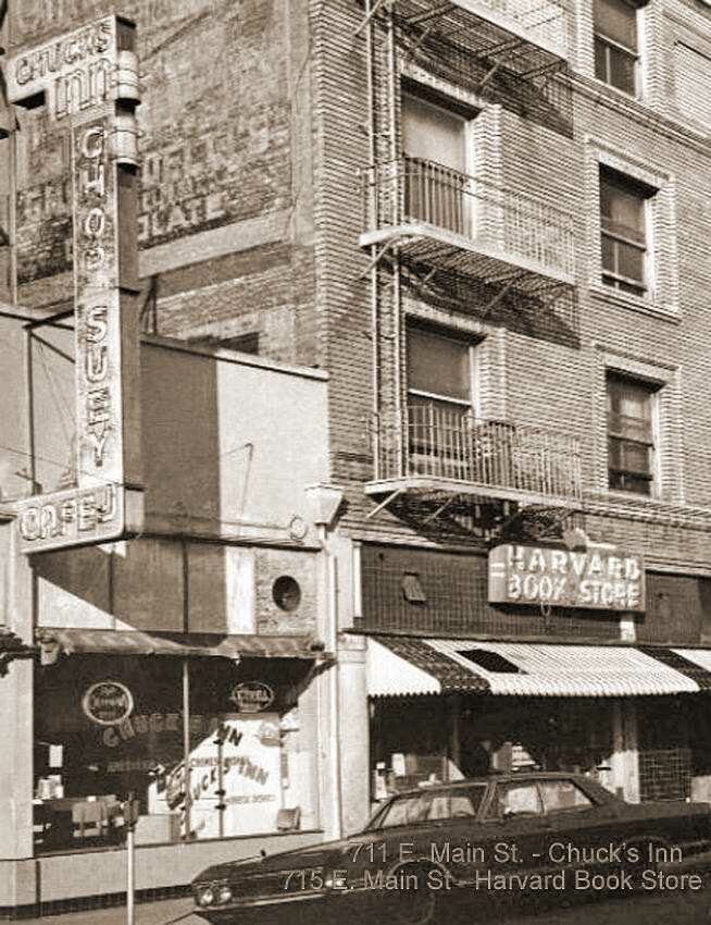 701-705 E. Main St. at Stanislaus - Gnekow Building. The building also has addresses at 2-10 North Stanislaus. Cedar's Fountain - Ventura Hotel - This building is present on the 1895, 1917, and 1950 Sanborn Maps. By 1950, the map shows that an original projecting bay at the corner had been removed. The building has addresses on East Main and at 2-10 North Stanislaus. By 1925, the building was listed as the Ventura Rooms, and remained so through 1935. By 1930, the Busy Bee Market occupied a ground floor space, but its space was vacant by 1935. By 1940, individual residents were listed instead of the Ventura Rooms, and the Singer Sewing Machine Co. was listed in one other commercial spaces. By 1945, a billiards hall and cleaners were located here. The 1950 City Directory shows that the billiard hall was replaced by the Richmaid Fountain Lunch. 709 E. Main St. - New York Cleaners (1967)711 E. Main St. - Chuck's Inn (1950-76) 713 E. Main - Hackett Hartsock Studio Photographers (1943) 715 E. Main St. - Harvard Book Store / W.E. Rice Books (1950) / H.T. Boldt Books (1943) 700 E. Main St. - Velvacon Paints / Mint Card Room / Mint Social Club (60) / Stockton Bible House (1950) / Harry Goon Meats (1943)