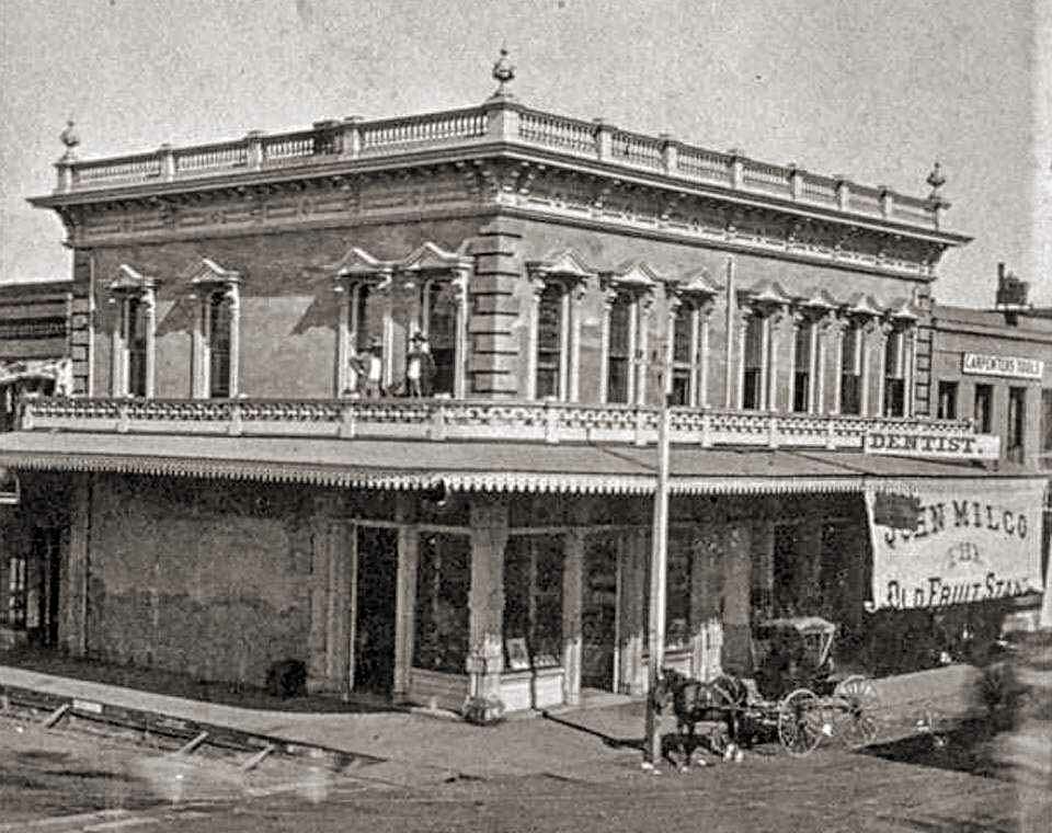 Main & Hunter SE corner - Stockton Oddfellows - The next building is 26-28 South Hunter Street - minus the bell tower - SFD Engine Company 2 and Hook & Ladder Company 1. It was erected in 1868 for the joint use of the "Hooks" and "Eurekas" of the Volunteer Department. - Demolished