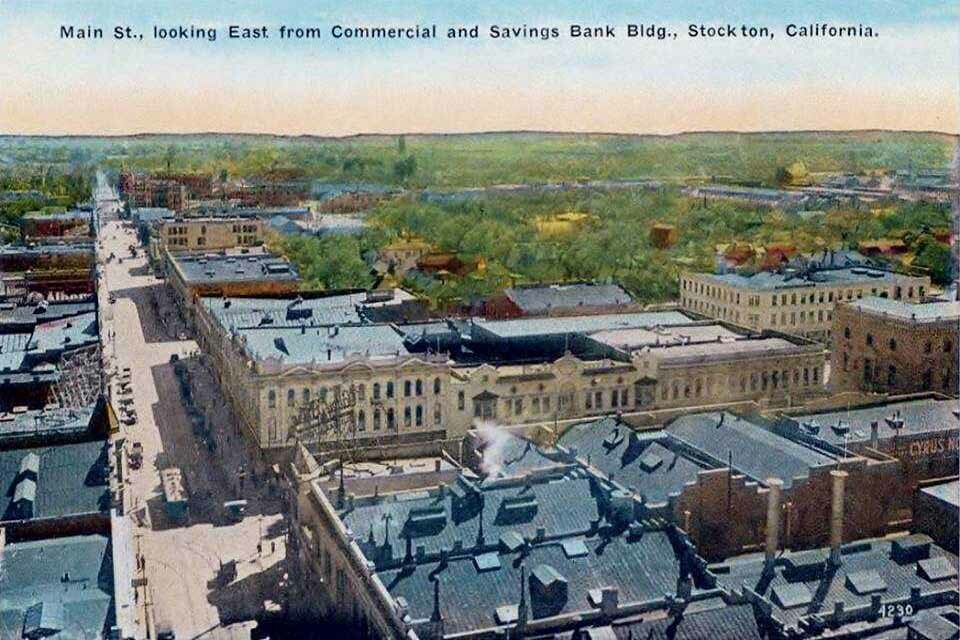 132 E. Main & Hunter SW Corner - McKee Block - Stockton Savings & Loan Society - The bank was started in 1867 and initially located at the SW corner of Main & Hunter. They later became the Bank of Stockton, the second bank chartered and the second oldest California bank operating under its original charter. Stockton Savings & Loan Society (Bank of Stockton) occupied this building from 1875 until they built their "skyscraper" on Main & San Joaquin in 1908. The Sterling Women and Children's Clothing store occupied this building from1908 in to the1960's. The store was four stories and included an elevator. - Demolished