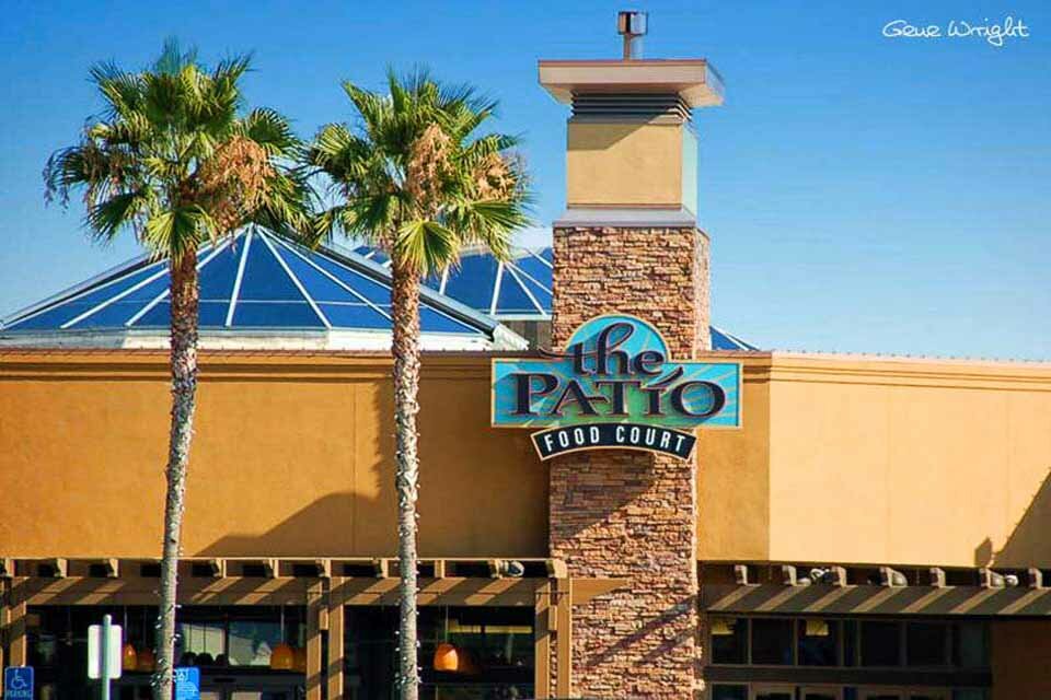 The Patio Food Court - Restaurants in the Food Court include: Chinese Gourmet Express, Hot Dog On A Stick, McDonald's, Orange Julius, PizzaGo, Subway / TCBY, Toda Sushi & Tepayaski Grill - Left photo shot from the sidewalk using a long lens